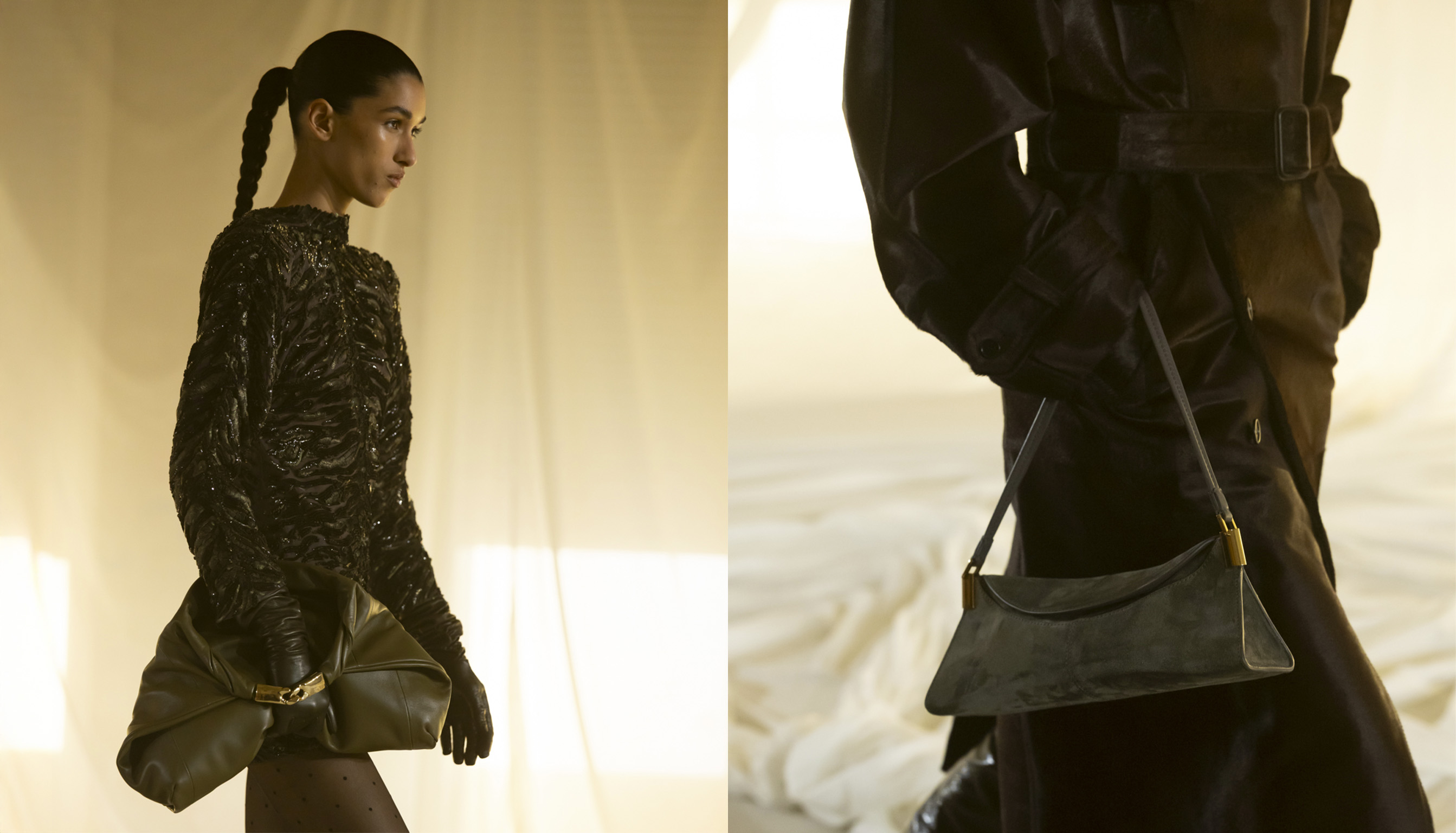 Antonin Tron’s new bags iterate the notion of tactility and practicality shaded with sensuality: the Sphynx, its softness contained by its hourglass silhouette; the hand-held Dinner at 8 clutch, inspired by Tron’s surfing kit, a utilitarian design made special and touchable.